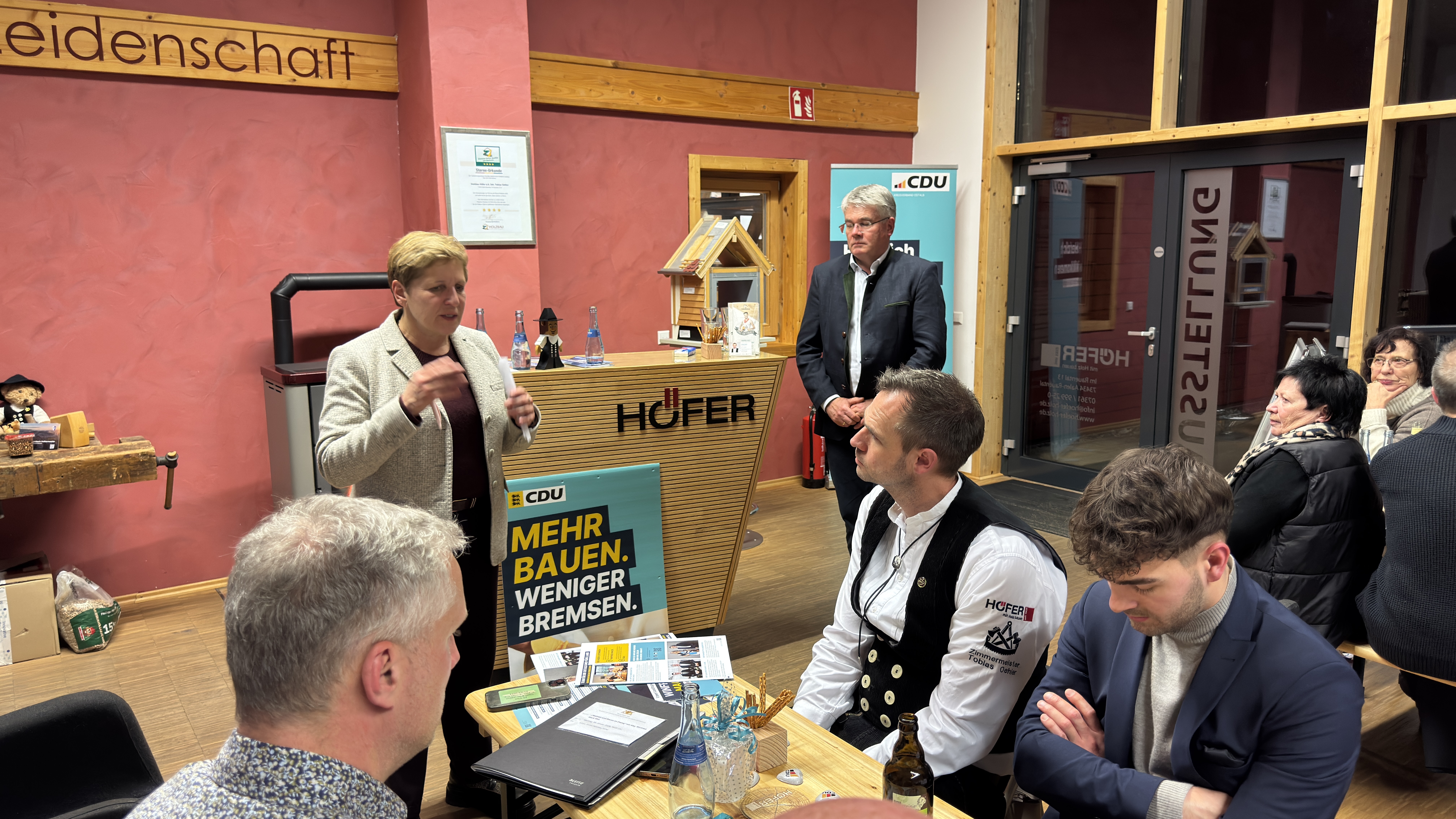 Beim Wohnen- & Bauen-Dialog. v.l. Winfried Mack MdL, CDU-Kreisvorsitzende Heike Brucker, Ministerin Nicole Razavi, CDU-Fraktionsvorsitzender Thomas Wagenblast, Holzbau-Höfer-Chef Tobias Oehler und Ortsvorsteher Hartmut SchlipfOrtsvorsteher Hartmut Schlipf lobte zu Beginn Tobias Oehler für sein politisches und gesellschaftliches Engagement, z.B. als Ortschaftsrat oder als Ausrichter des Josefsfest.