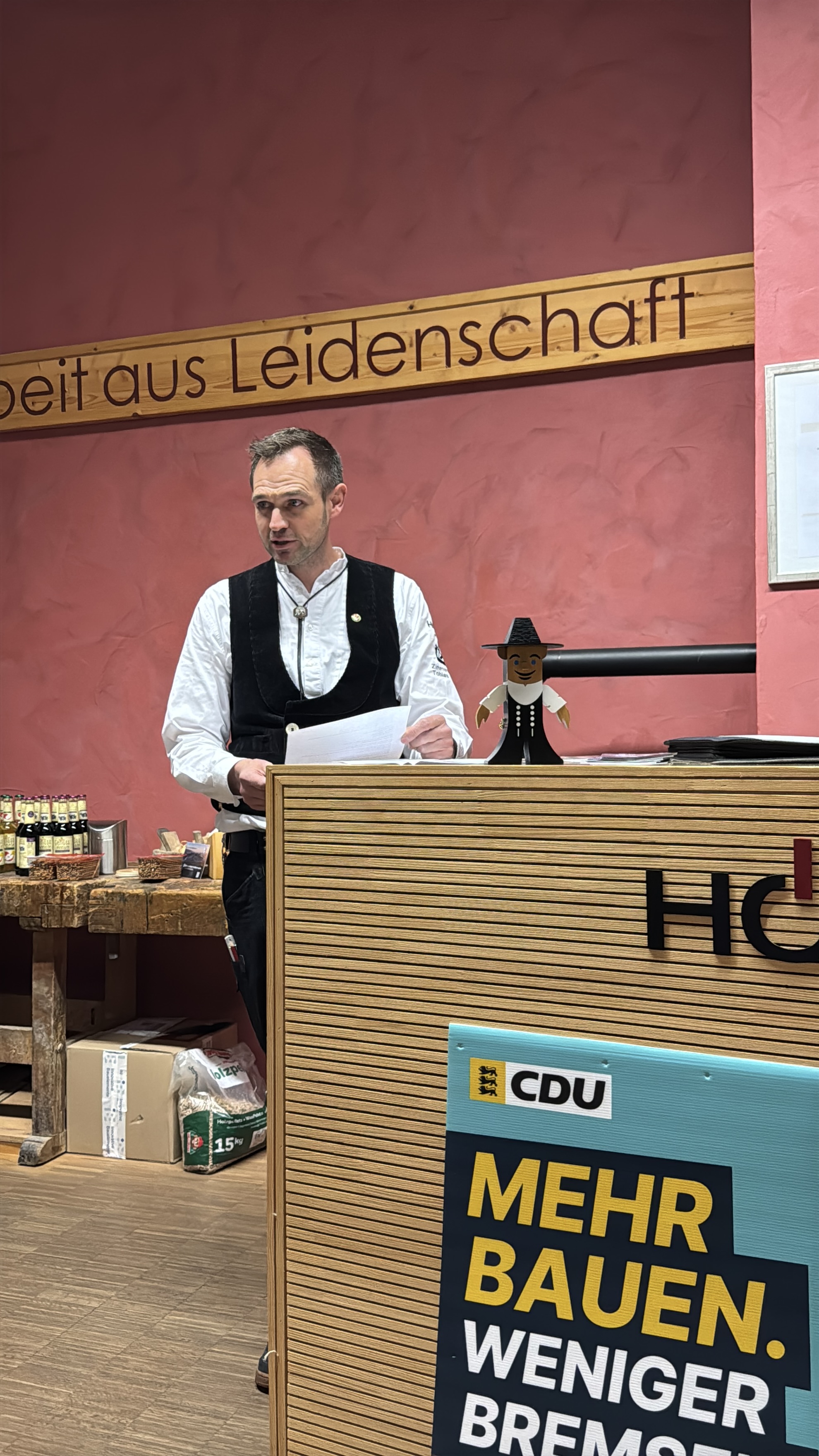 Tobias Oehler, Inhaber von Holzbau Höfer, schilderte aus der Praxis die zunehmenden Belastungen durch Bürokratie: „Bürokratie führt zu sinkender Produktivität. Wir haben inzwischen eine eigene Industrie, die mit Bürokratie Geld verdient.“ Zudem sprach er den Fachkräftemangel und die schwierige Unternehmensnachfolge an. Große Chancen sieht Oehler in Sanierungen im Bestand und in Aufstockungen bestehender Gebäude. Dafür brauche es jedoch verlässliche Förderprogramme und Rahmenbedingungen, die Investitionen ermöglichen: „Unternehmen müssen investieren, arbeiten und verdienen können. Man sollte Unternehmern mehr zutrauen. Die neue Landesbauordnung von Ministerin Razavi ist ein Schritt in die richtige Richtung.“