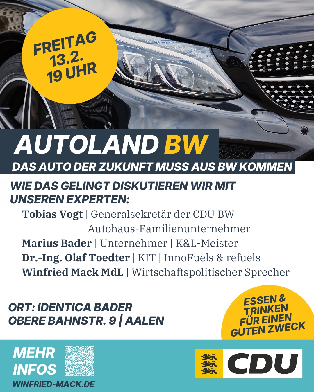 Unter dem Titel „Autoland BW – DAS Auto der Zukunft muss aus BW kommen“ laden wir herzlich zu einer Expertenrunde ein. Gemeinsam diskutieren Vertreter aus Politik, Forschung, Handwerk und Unternehmertum über die Zukunft der Mobilität – technologieoffen, praxisnah und mit klarem Blick auf die Stärken unseres Landes.