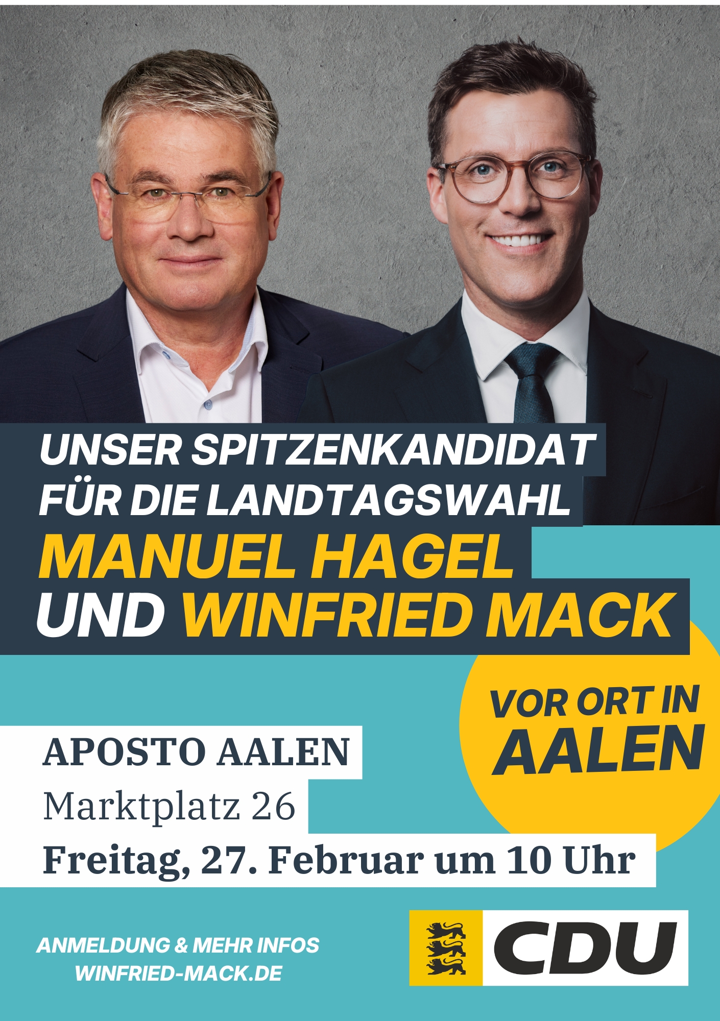Der Spitzenkandidat der CDU Baden-Württemberg für die Landtagswahl, Manuel Hagel, kommt nach Aalen! Als aussichtsreicher Kandidat für das Amt des Ministerpräsidenten bietet sich eine hervorragende Gelegenheit, ihn persönlich kennenzulernen und seine Vision für unser Land zu erleben.