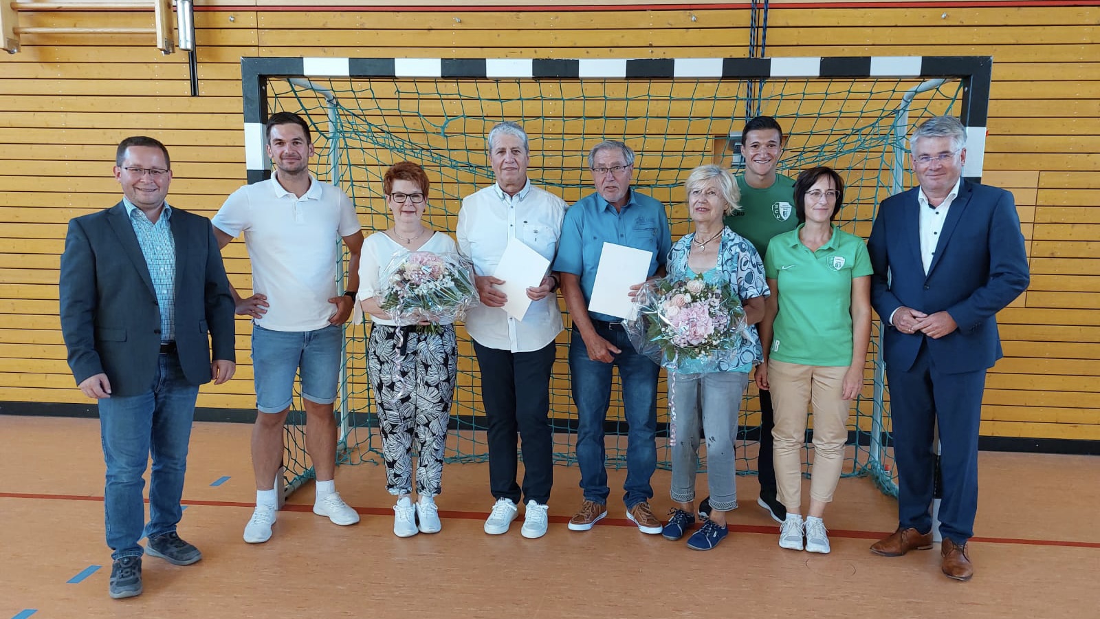 Verleihung der Ehrennadel des Landes an Nikolaus Bühler (5.v.l.) und Manfred Zeller (4.v.l.) durch Winfried Mack und Bürgermeister Johannes Joas (l.)Winfried Mack und Bürgermeister Johannes Joas überreichten im Auftrag von Ministerpräsident Kretschmann die Ehrennadel des Landes Baden-Württemberg an Nikolaus Bühler und Herrn Manfred Zeller. Da beide Geehrten für ihre ehrenamtliche Tätigkeit beim Sportclub Unterschneidheim (SCU) ausgezeichnet wurden, bildeten die Unterschneidheimer Festtage, die der SCU ausrichtet, den idealen Rahmen.