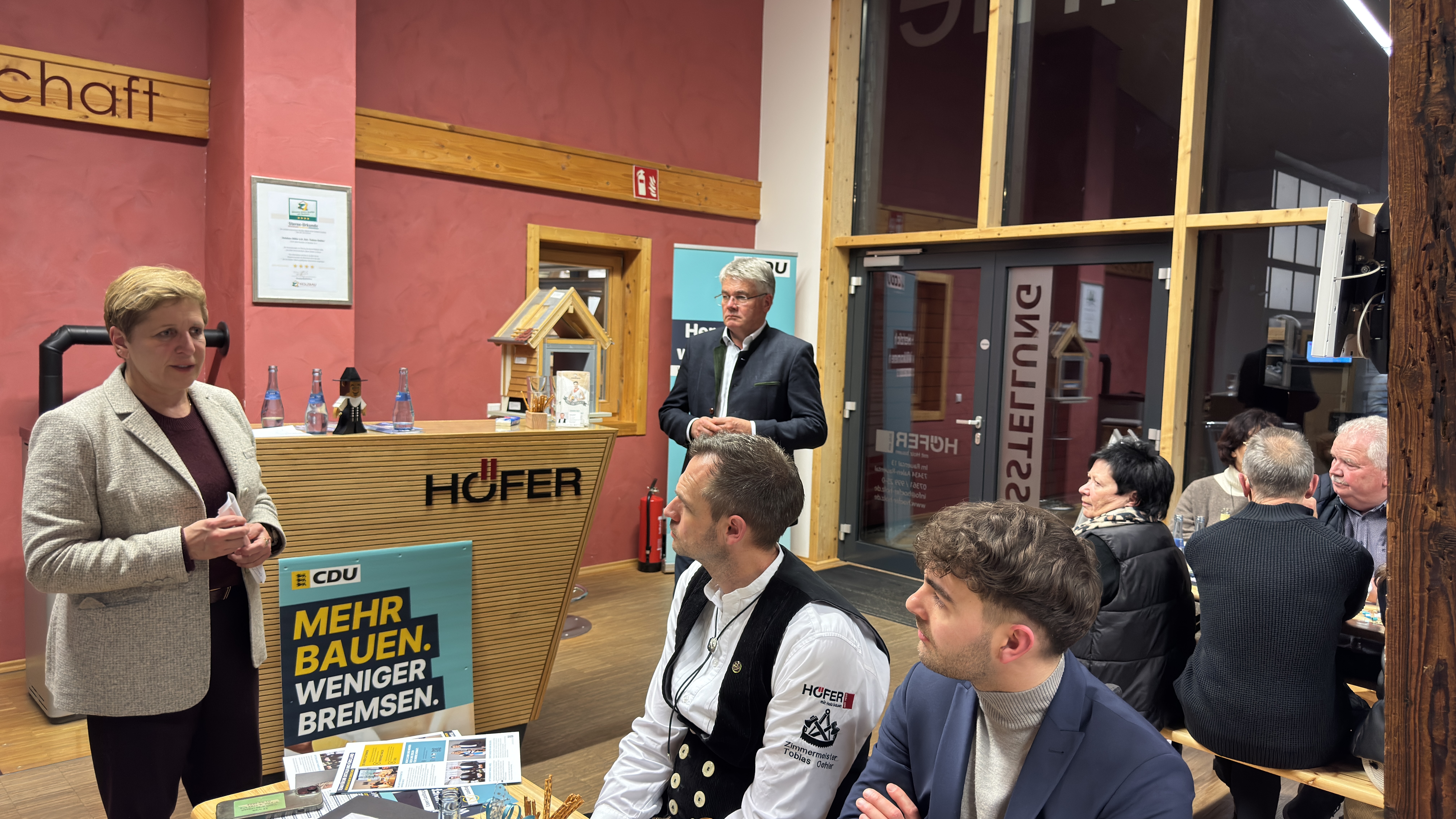 Beim Wohnen- & Bauen-Dialog. v.l. Winfried Mack MdL, CDU-Kreisvorsitzende Heike Brucker, Ministerin Nicole Razavi, CDU-Fraktionsvorsitzender Thomas Wagenblast, Holzbau-Höfer-Chef Tobias Oehler und Ortsvorsteher Hartmut SchlipfOrtsvorsteher Hartmut Schlipf lobte zu Beginn Tobias Oehler für sein politisches und gesellschaftliches Engagement, z.B. als Ortschaftsrat oder als Ausrichter des Josefsfest.