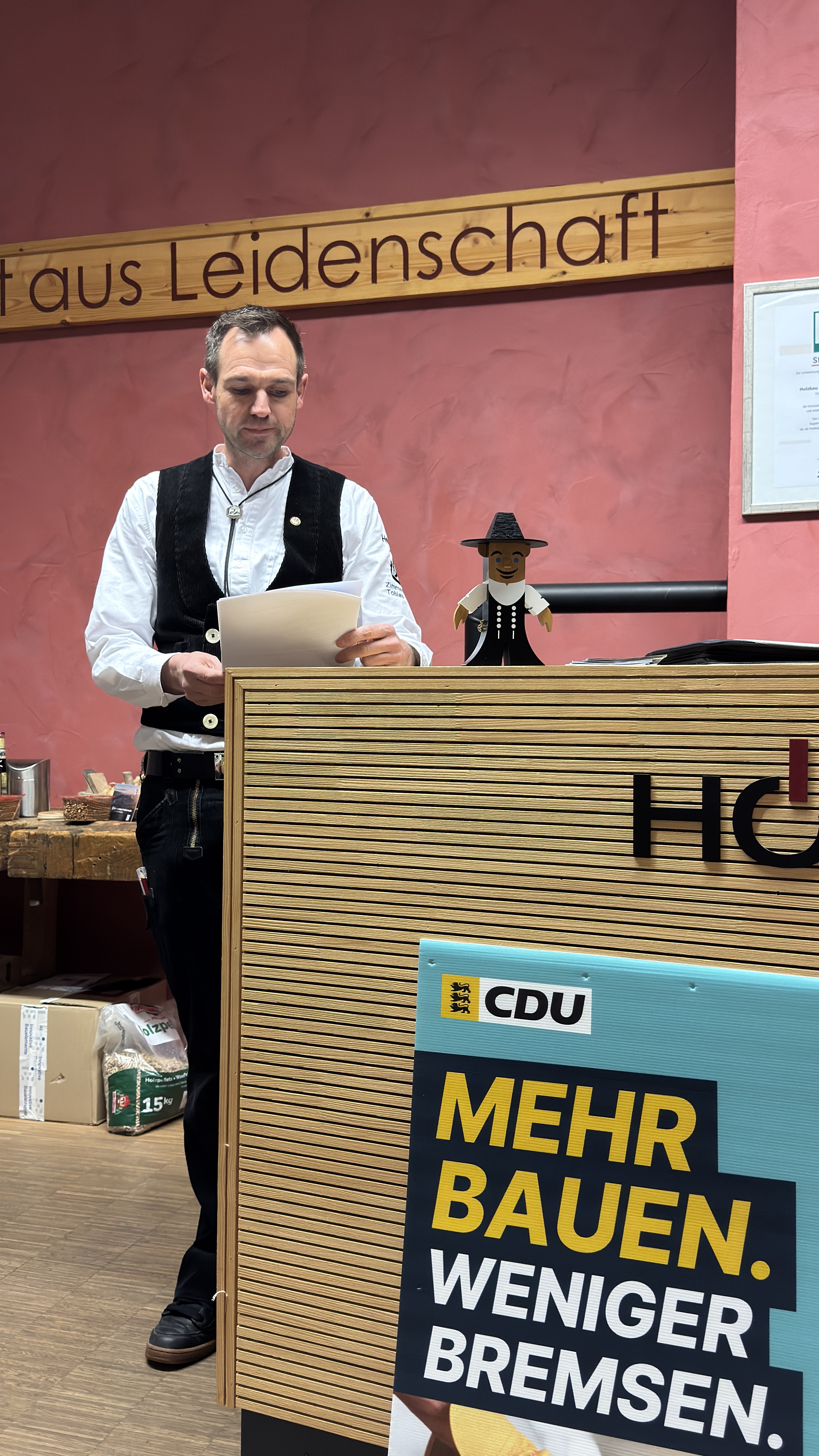 Tobias Oehler, Inhaber von Holzbau Höfer, schilderte aus der Praxis die zunehmenden Belastungen durch Bürokratie: „Bürokratie führt zu sinkender Produktivität. Wir haben inzwischen eine eigene Industrie, die mit Bürokratie Geld verdient.“ Zudem sprach er den Fachkräftemangel und die schwierige Unternehmensnachfolge an. Große Chancen sieht Oehler in Sanierungen im Bestand und in Aufstockungen bestehender Gebäude. Dafür brauche es jedoch verlässliche Förderprogramme und Rahmenbedingungen, die Investitionen ermöglichen: „Unternehmen müssen investieren, arbeiten und verdienen können. Man sollte Unternehmern mehr zutrauen. Die neue Landesbauordnung von Ministerin Razavi ist ein Schritt in die richtige Richtung.“